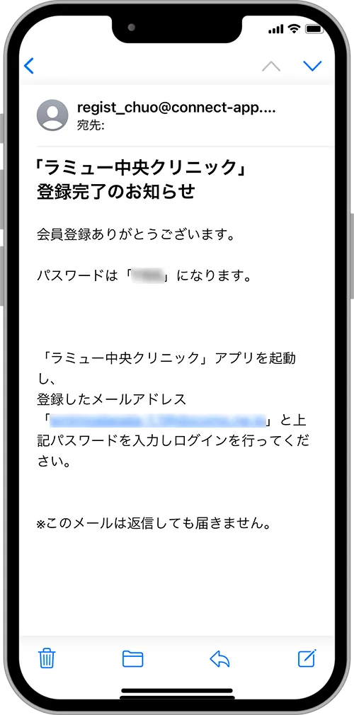 返信メールが届きます。パスワード・メールアドレスを確認します。