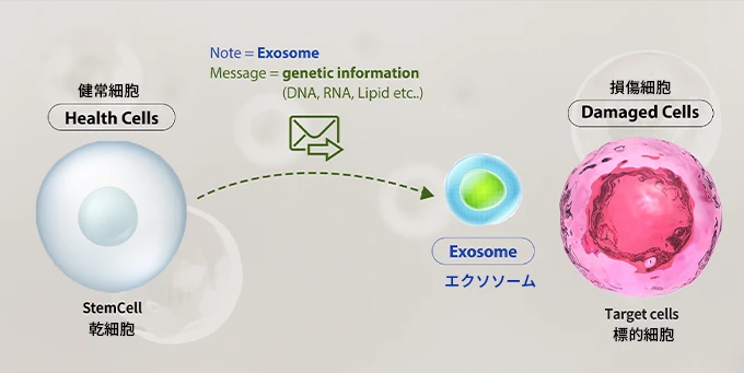エクソソームは人の体内を活発に循環している物質で、分泌細胞からターゲット細胞にメッセージを伝えるメッセンジャーとしての役割があります。