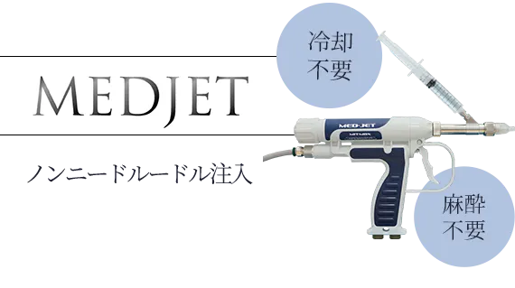 炭酸ガスの噴射による圧力で先端30ミクロン(0.03mm)の穴から薬剤を皮膚の中に散布する。 ハリを使わない注入法ですので、注射が怖い方にも安心して治療を受けていただけます。