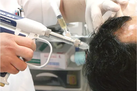 パピュール法は、注入器を使って熟練したドクターの手技によって1ヵ所1ヵ所丁寧に、直接頭の表皮と真皮の間に薬剤を注入し、発毛有効成分を浸透させていく方法です。
