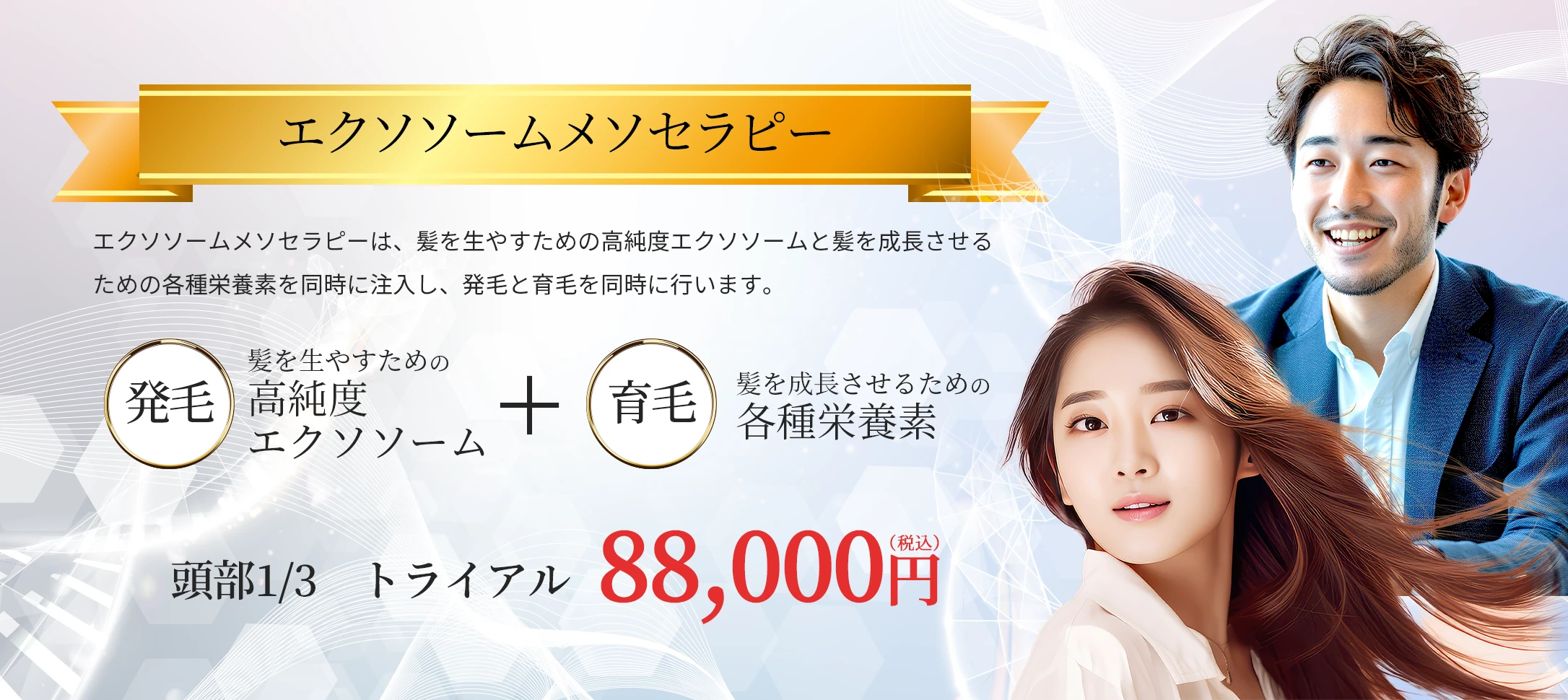 エクソソームメソセラピーは、高純度エクソソームと髪を成長させる各種栄養素(銅ペプチド,アミノ酸,ビタミン(B5、B6、 B3),ヒアルロン酸,コエンザイムQ10,植物性幹細胞ブースター等)を同時に注入し育毛と発毛を促します。
