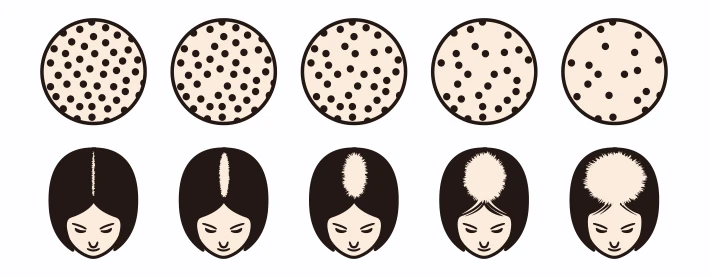 男性の脱毛のように局所的に薄くなるのではなく、頭全体がゆっくり、広い範囲で薄くなっていくのが特徴です。