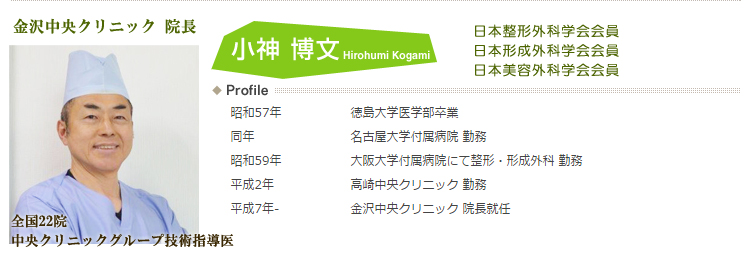 金沢中央クリニックは全国19院 美容外科中央クリニックグループ内でも技術指導医としてこれまで多くの医師の教育してきた小神院長が治療担当医です。美容外科クリニックとして27年の症例経験と、より良い治療を提供し皆様に喜んでいただけるよう、最先端の知識・技術を提供することをお約束いたします。また、他院によくあるアルバイトドクターや研修医など経験の浅い未熟な医師が施術することはございませんのでご安心ください。